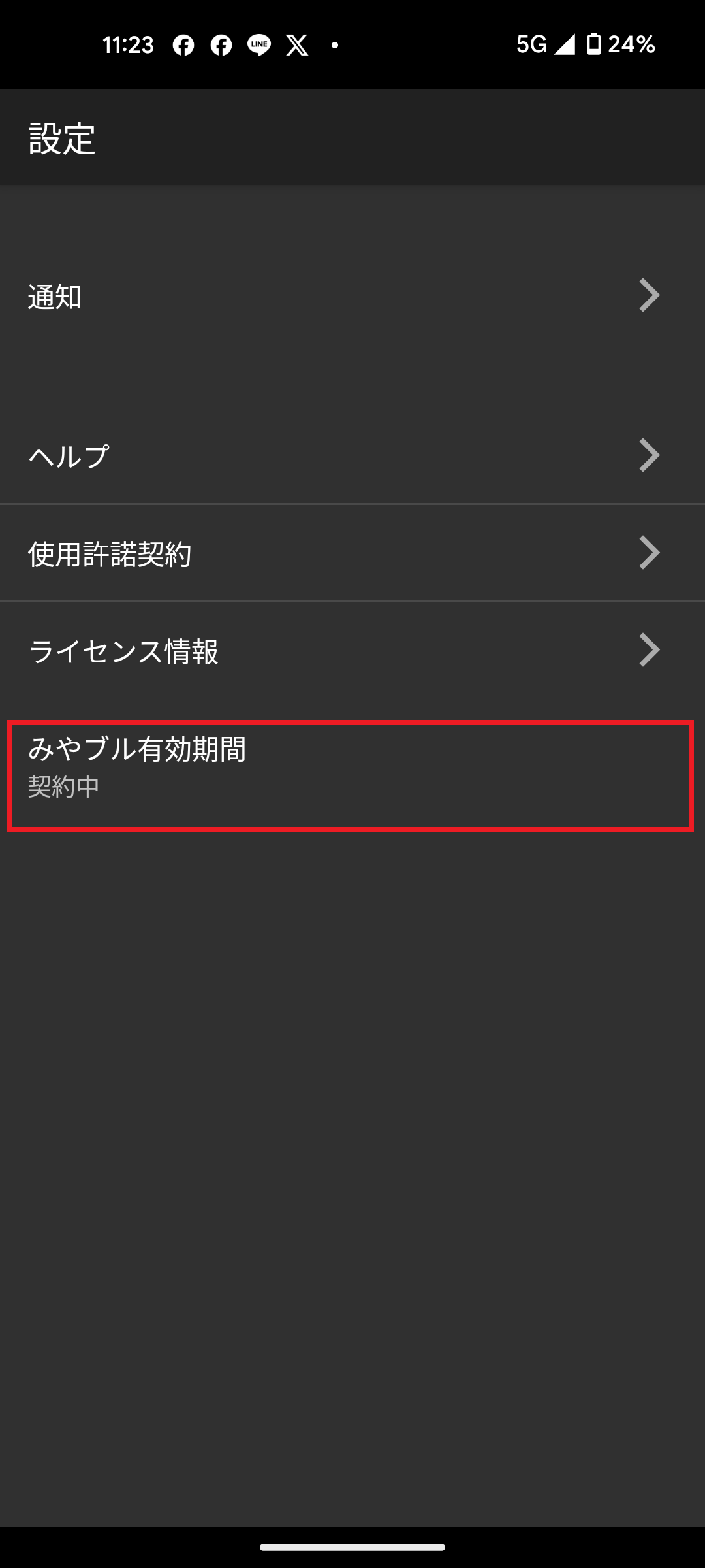 ②一番下にある「みやブルの有効期間」の下に「契約中」のと表示されていれば更新手続きは問題なく完了しています。